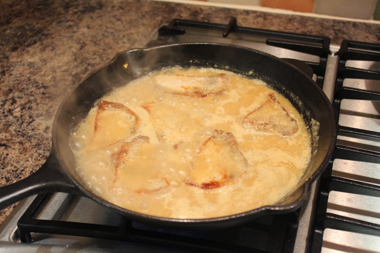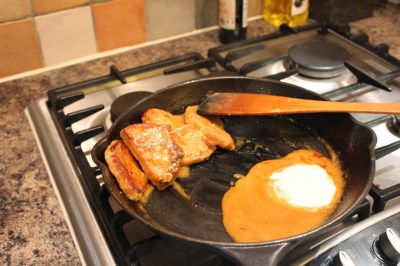 Mix in creme fraise into the sauce. You might want to plate the pork and get the hob going for a couple of seconds, just to make sure that sauce is even. Voila!