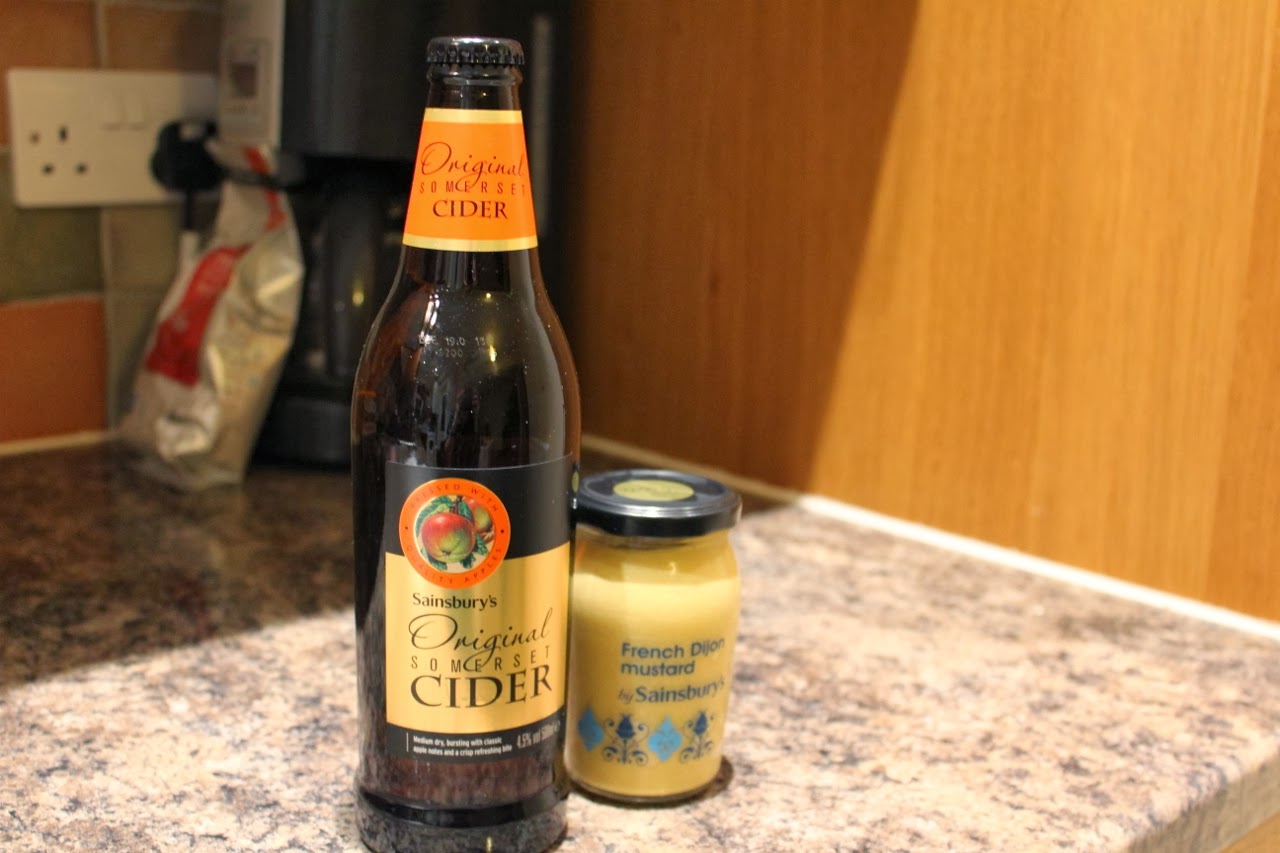 Season the pork and fry on both sides until golden-brown. Pour the cider in the pan. When it starts boiling, add the mustard in. Simmer for a couple of minutes to get an even texture.