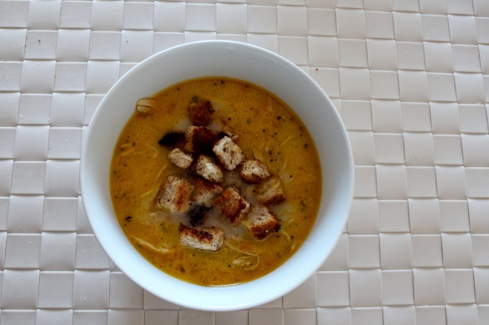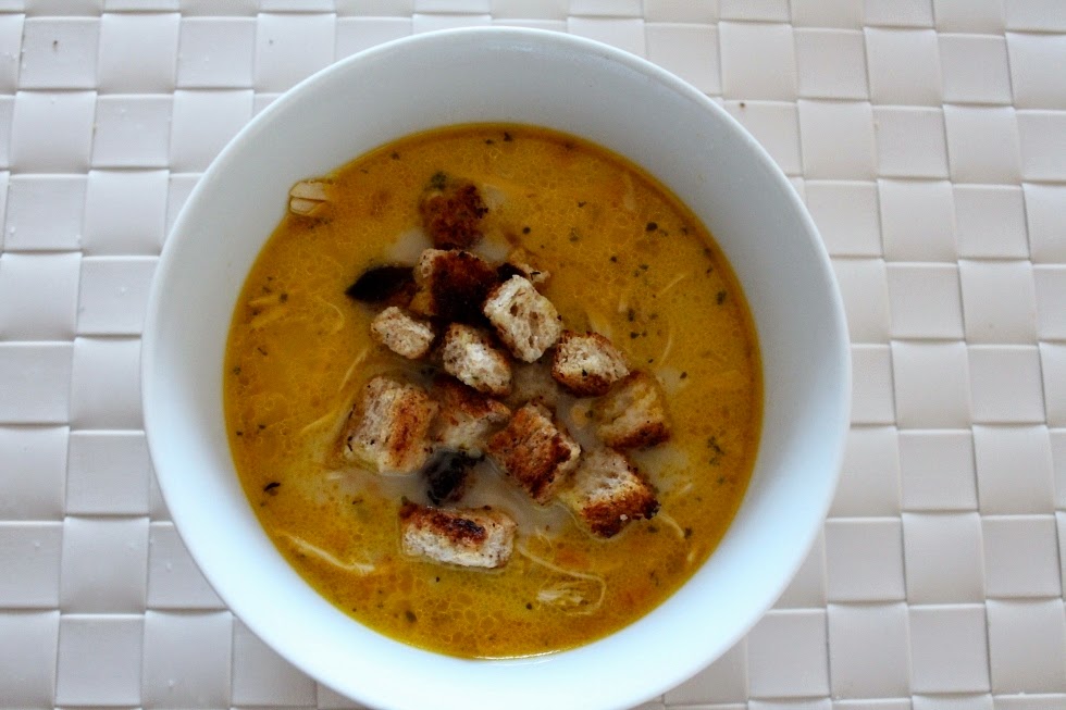 Cheese spread infused chicken soup with croutons.