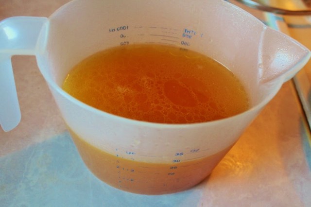 After an hour take the chicken out of the pan and set aside to cool down. Sift the rest of the stock so it doesn’t have any bits. Place back into the pan.