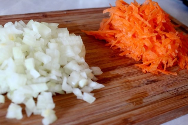 Meanwhile chop the onion and grate the carrot.